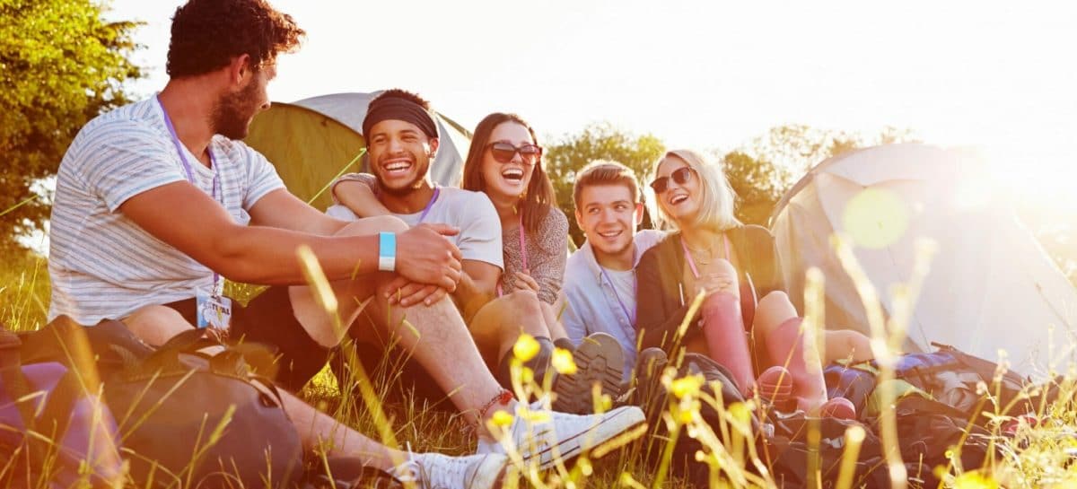 Group Of Friends Relaxing Outside Tents On Camping Holiday